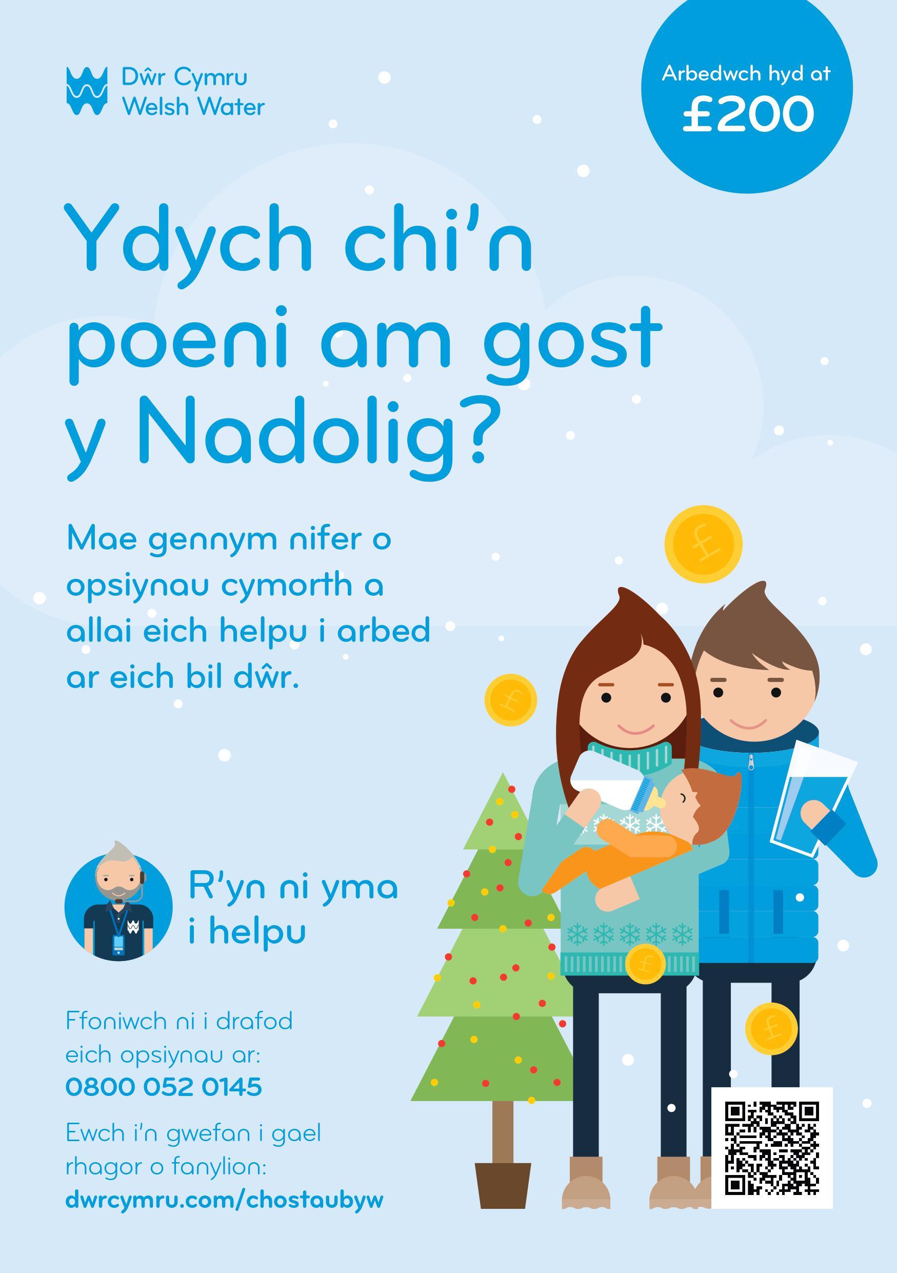 Os ydych chi’n pryderu am gost y Nadolig, gall Dŵr Cymru ddarparu opsiynau cefnogaeth ariannol sydd ar gael i’ch helpu i arbed arian ar eich bil dŵr. I drafod eich opsiynau, ffoniwch nhw ar: 0800 052 0145.