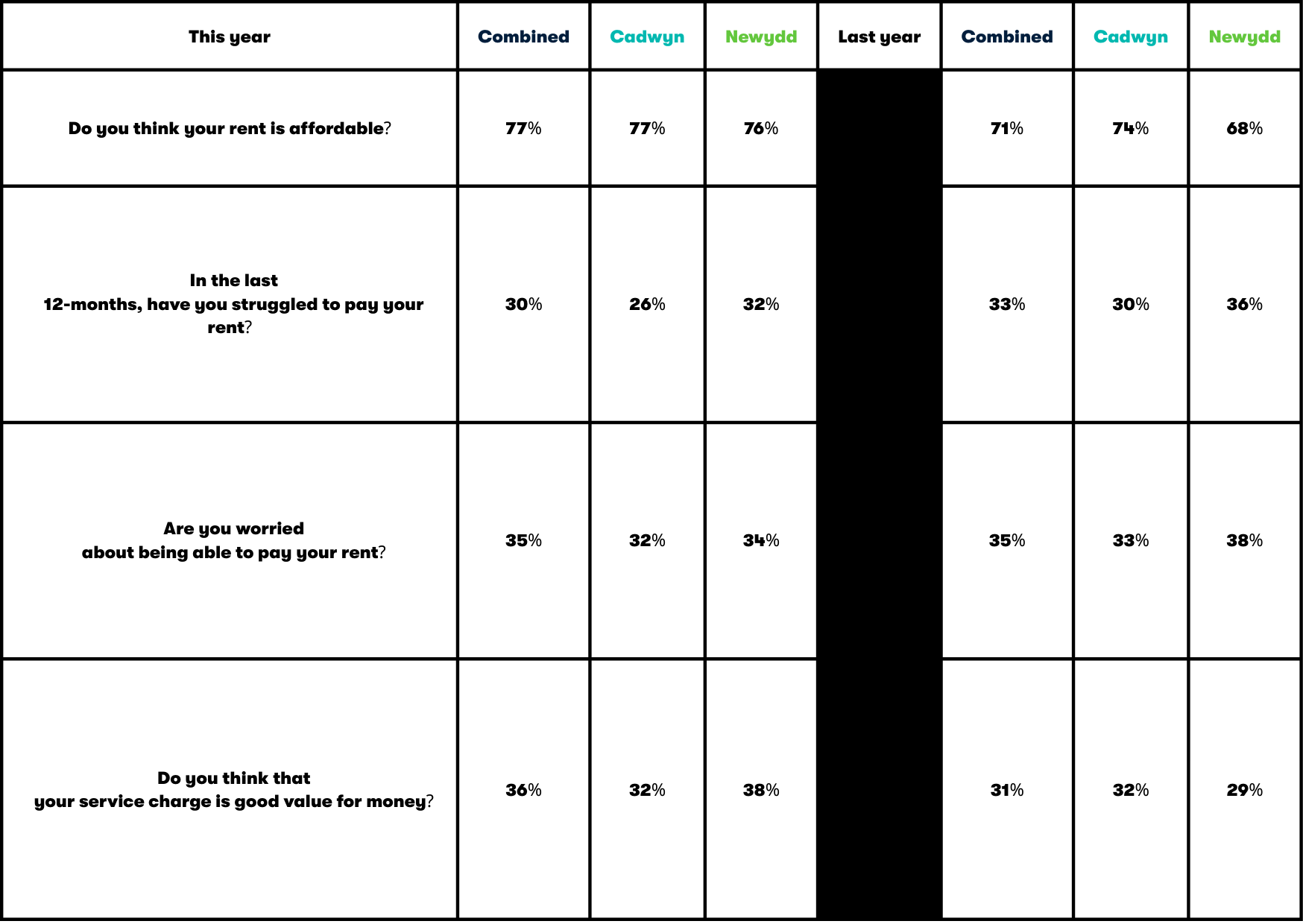 We also consider the feedback we get on rent and service charge affordability through our quarterly tenant satisfaction surveys that a market research company called Acuity conduct for us. In 2024/25 84% of Newydd tenants considered their rent to be value for money and 63% of tenants considered their service charge to be value for money. Historically, Cadwyn currently carried out their tenant satisfaction surveys every 2 years ,but we have changed this and now have two quarters of recent data that average out to 83% satisfaction with rent and 58% satisfaction with service charges.